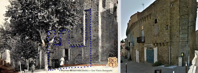 Une carte postale d'il y a plus de cent ans avec la maçonnerie médiévale, tracée en bleu. Le reste de la maçonnerie (à l'exception des ouvertures) date principalement de la fin du XVe ou de la première moitié du XVIe siècle. À droite: la même partie de la Rue Jean Jaurès sur google street view juillet 2018 ©Google2021