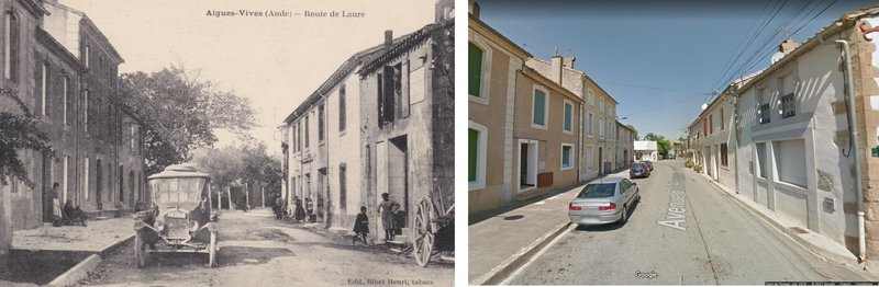 carte postale 1920 - édition Bibet Henri , tabacs et Google street view juillet 2018 ©Google2021Cette carte postale éditée en 1920, on la trouve depuis 2021 sur le site internet de la mairie d'Aigues-Vives qui a repris une partie des activités de l'ancienne Association Histoire d'Aigues-Vives. La photo montre l'Avenue de la Promenade (Route de Laure) avec au premier plan une T-Ford de 1917 ou 1918. Sa plaque d’immatriculation 1850-A a probablement été émise en 1920 (Identification grâce à un article de Royce Peterson, mtfca.com, à une photo d'AutoBarn Classic Cars et par le Système d'immatriculation Français)
