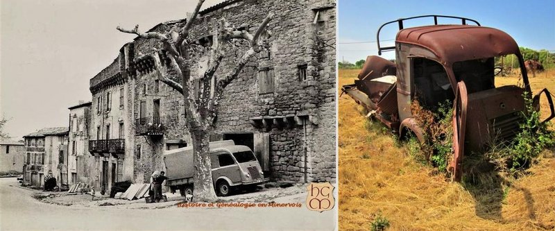 Une Renault Goélette plateau baché; il s'agit du premier type R2061 - 1400kg de 1949/1950 car les portières 'suicide' s'ouvrent encore dans le mauvais sens. À droite un modèle d'après 1950, photographié en 2020 à La Livinière; ses portières s'ouvrent clairement vers l'avant! (Voir plus d'épaves du modèle Goélette dans mon post Renault). Le platane a été taillé récemment. Cela indiquerait que cette photo des années 1950 était prise en automne ou hiver. Apparemment la récolte du potager a été stockée dans la cave. L'homme charge un sac d'oignons et deux boîtes de légumes(?). Il a garé sa Goélette juste devant la partie la plus ancienne (XIe - XIIe siècle) de l'enceinte du Castrum. Les ouvertures dans la maçonnerie médiévale n'ont été réalisées que dans le XIXe siècle. Mais au XXe siècle l'entrée de la cave a été élargie à plusieurs réprises.